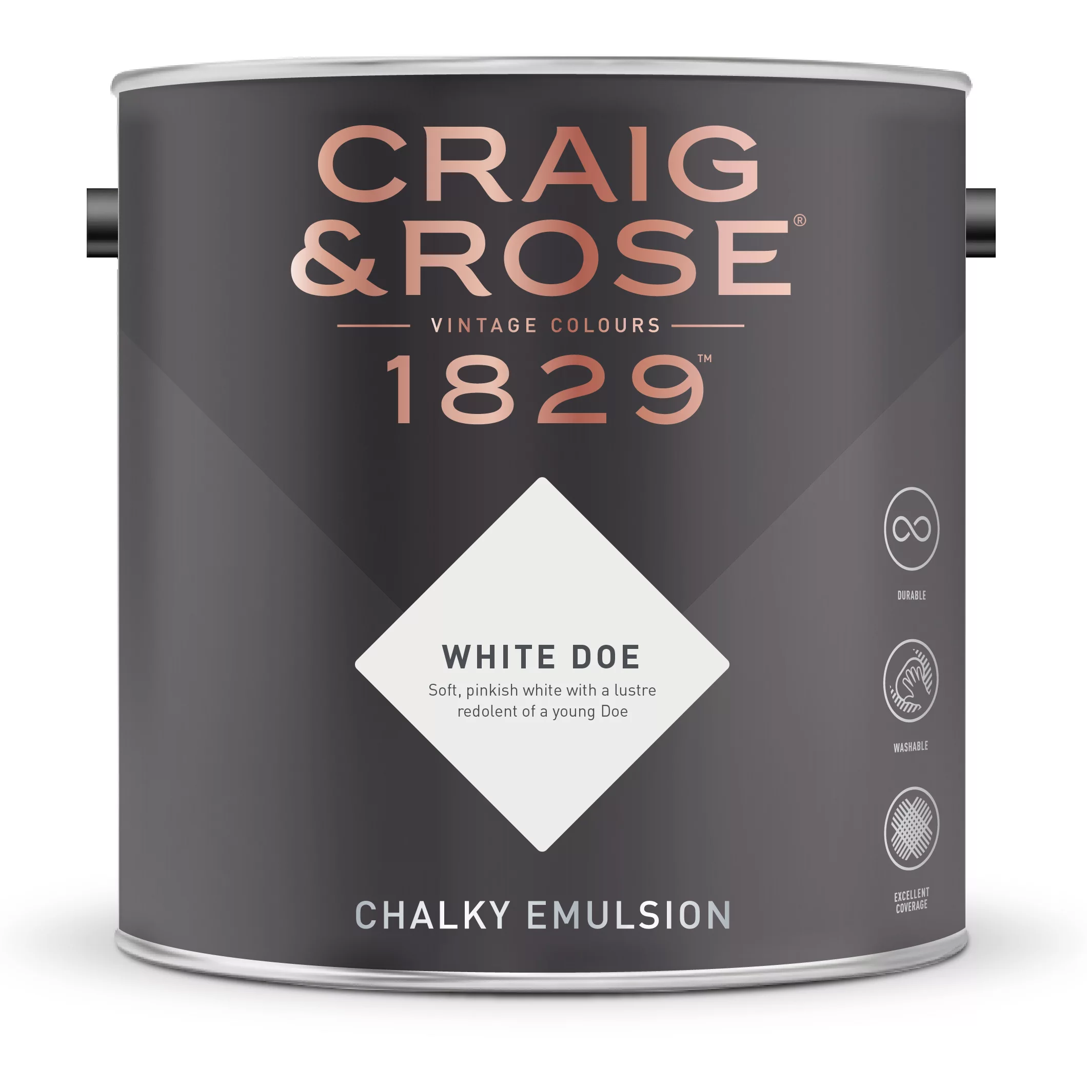 - Craig & Rose are famous for their durable Chalky Emulsion – a luxurious soft and chalky matt finish with excellent depth of colour, superior coverage and a finish that can be wiped down. This renowned emulsion is perfect for interior walls and ceilings and can also be used for upcycling furniture when finished with a protective wax or varnish. White Doe is a soft and pinkish white with a hint of lustre evocative of the tones in the hide of a young Doe. Use with 1829 White Undercoat.